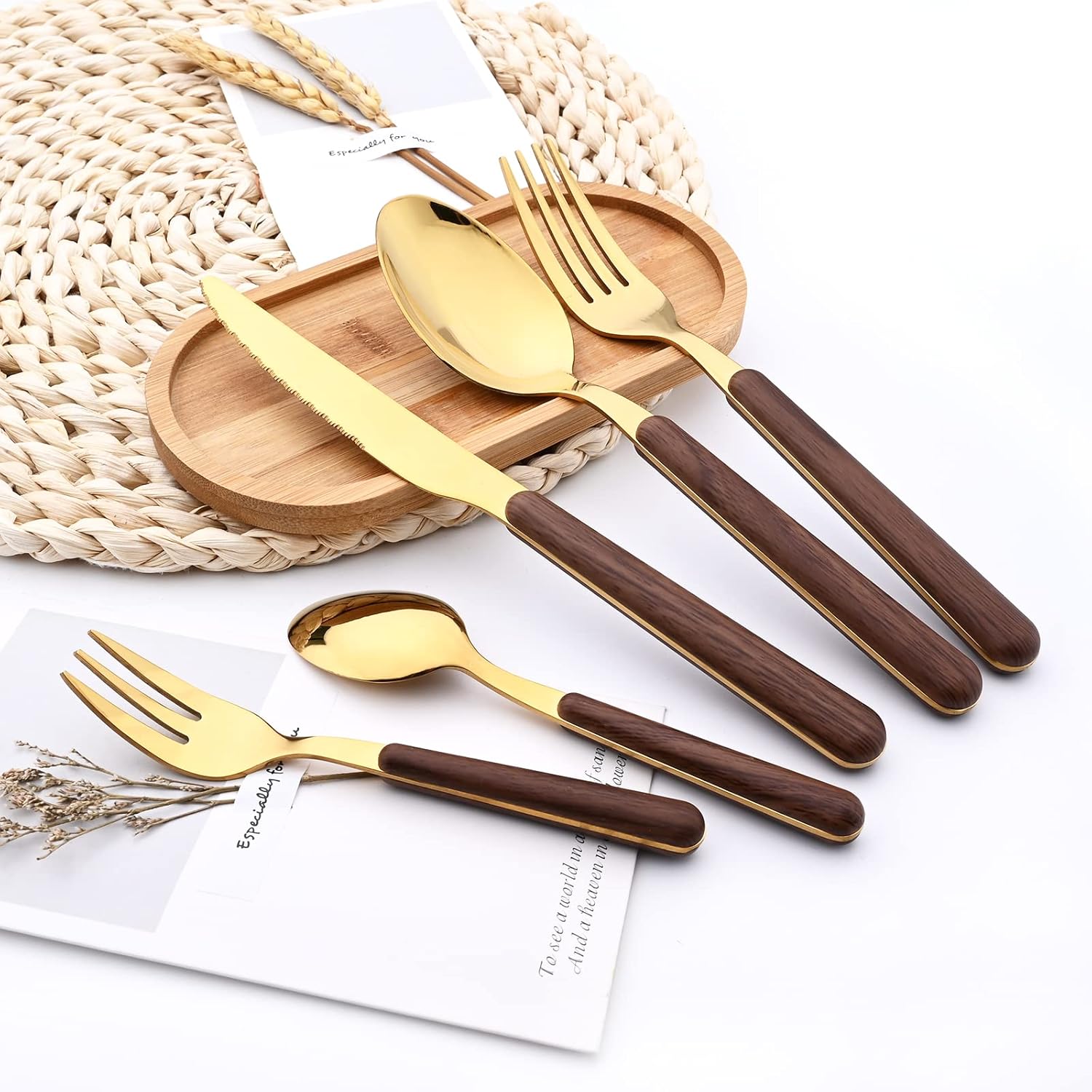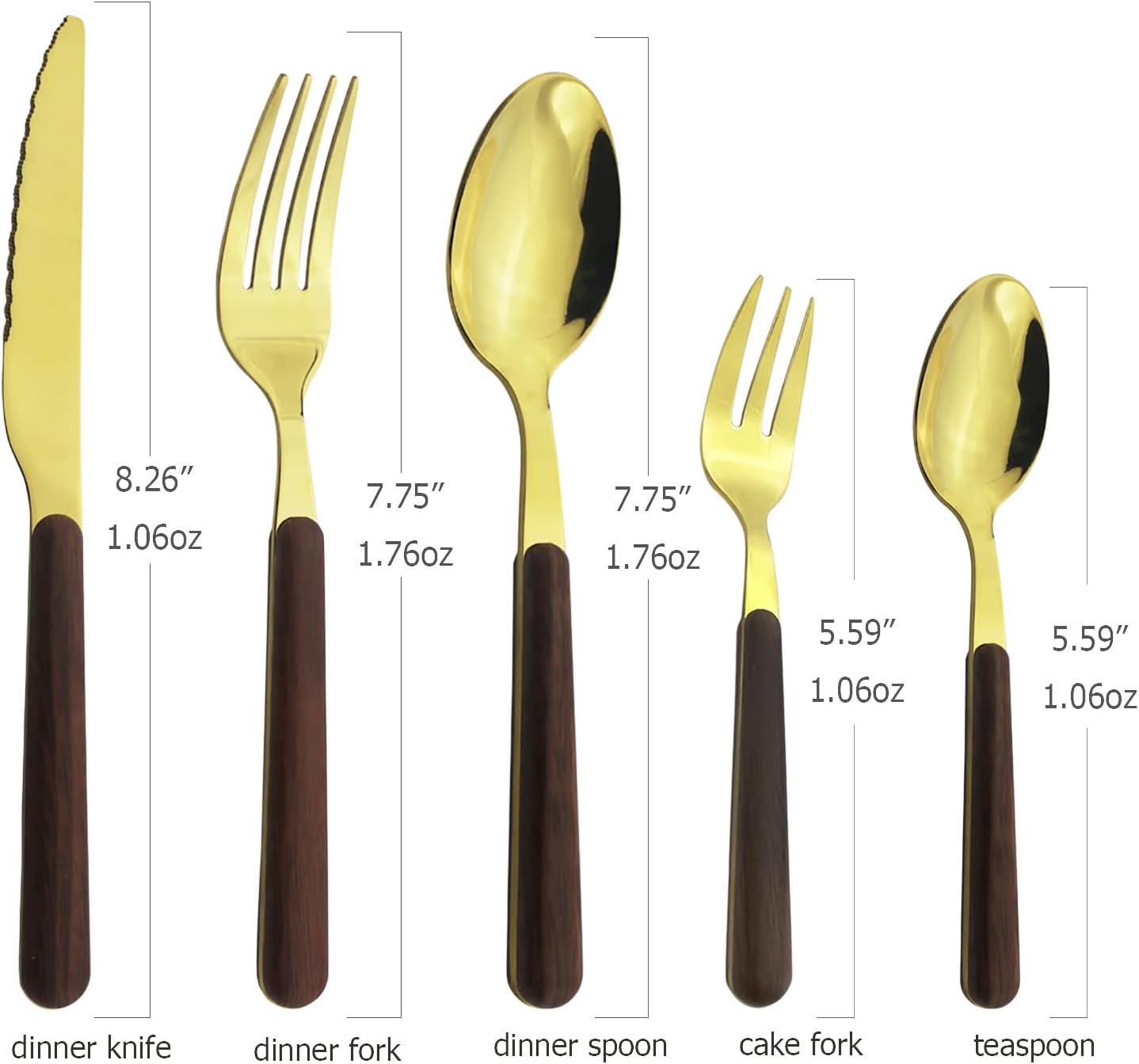 Color:Brown & Gold Unique Design - Creative wooden handle clamps stainless steel tableware, and the smooth curve enhances your dining experience. - Suitable for use in Wedding,hotels, homes, bars, parties, picnics, barbecues, kitchen, restaurant, and so on. size Dinner Knife Length: 21cm/8.26" weight: 30g/1.06oz Dinner Fork Length: 19.7cm/7.75" weight: 50g/1.76oz Dinner Spoon Length: 19.7cm/7.75" weight: 50g/1.76oz Tea Spoon Length: 14.2cm/5.59" weight: 30g/1.06oz Cake Fork Length: 14.2cm/5.59" weight: 30g/1.06oz Using Instruction 1. Please wash the cutlery set with warm soapy water before first using to wash off any processing residue left from manufacturing. 2. Please clean and dry the flatware set after using for your healthy daily use, and store in dry place for its durability. 3. Please use soft towel to clean the set; Do not use iron wire to destroy their smooth surface. All tableware are designed according to ergonomics, suitable weight and comfortable placement, suitable for any scene, creating the most comfortable dining experience for you.