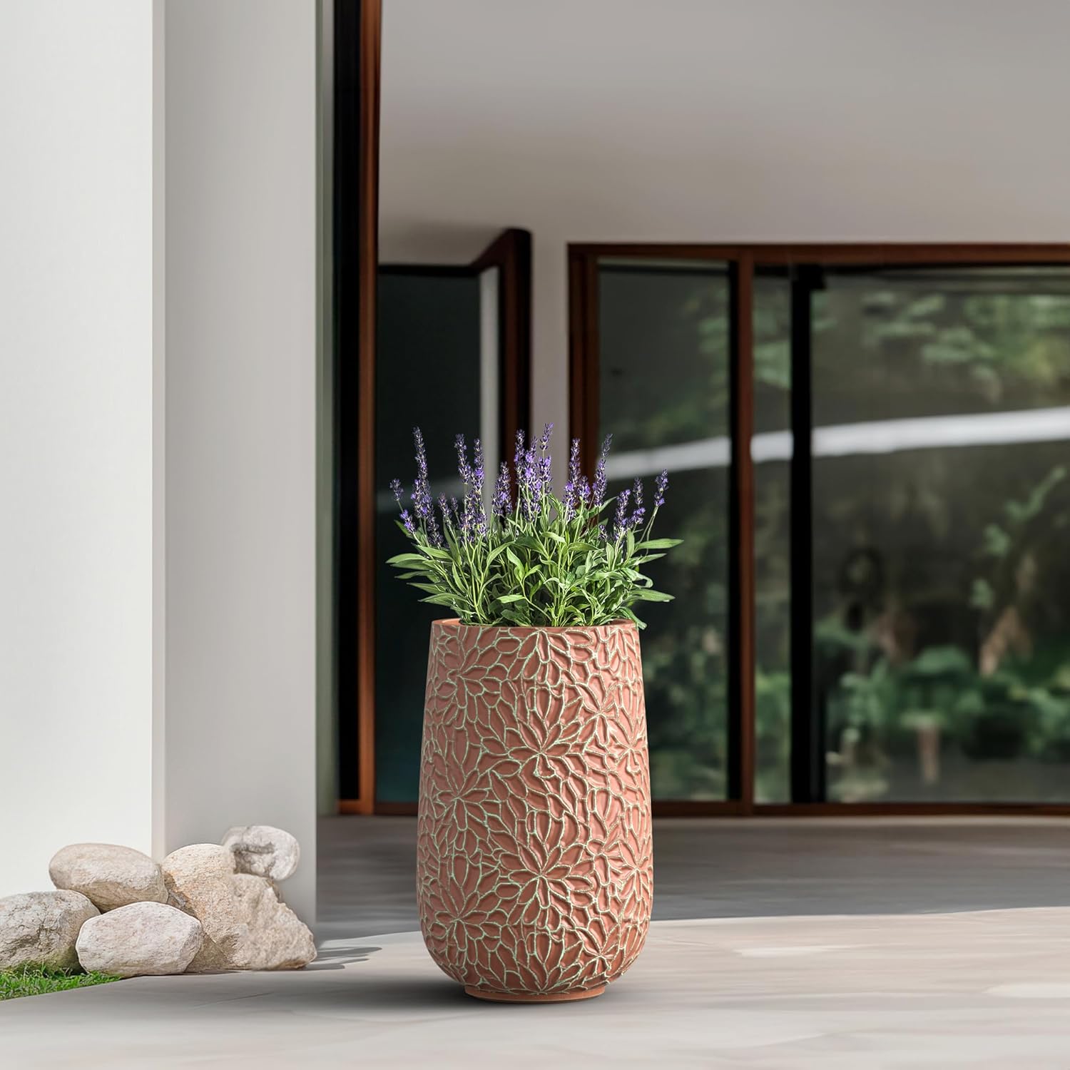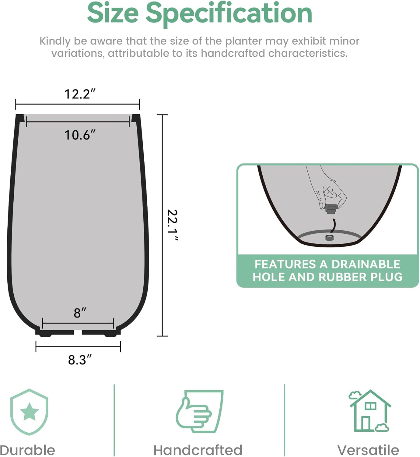 Humid Jade 22-Inch Tall Embossed Floral Pattern Concrete Planter, Mineral Speckled Surface Round Plant Pot with Drainage for Patio, Garden, Porch, Verdigris Mist Elegant Concrete Planter – Discover a modern design with smooth, flowing curves and a naturally weathered finish that exudes timeless appeal. Crafted with care, this statement piece seamlessly blends contemporary style with organic texture, featuring subtle pores that enhance its authenticity. It adds a refined touch of character to different surroundings.Handmade Plant Pot – Made from a premium concrete mixture, this pot maximizes durability, strength, and resistance to weather and damage. Its enduring color, combined with UV resistance, ensures that it maintains its vibrant appearance under the outdoor conditions.Large & Versatile – Whether showcasing a plant indoors or positioned on the front steps, porch, or patio, this generously sized planter enhances modern, minimalist, and traditional styles with its unique design. Its versatility makes it well-suited for a variety of settings.Drainage System – Our planter pot features drainage holes for efficient water management, each equipped with a rubber plug for both indoor and outdoor use. Enjoy effortless gardening with minimal upkeep, promoting a healthy environment for your plants.