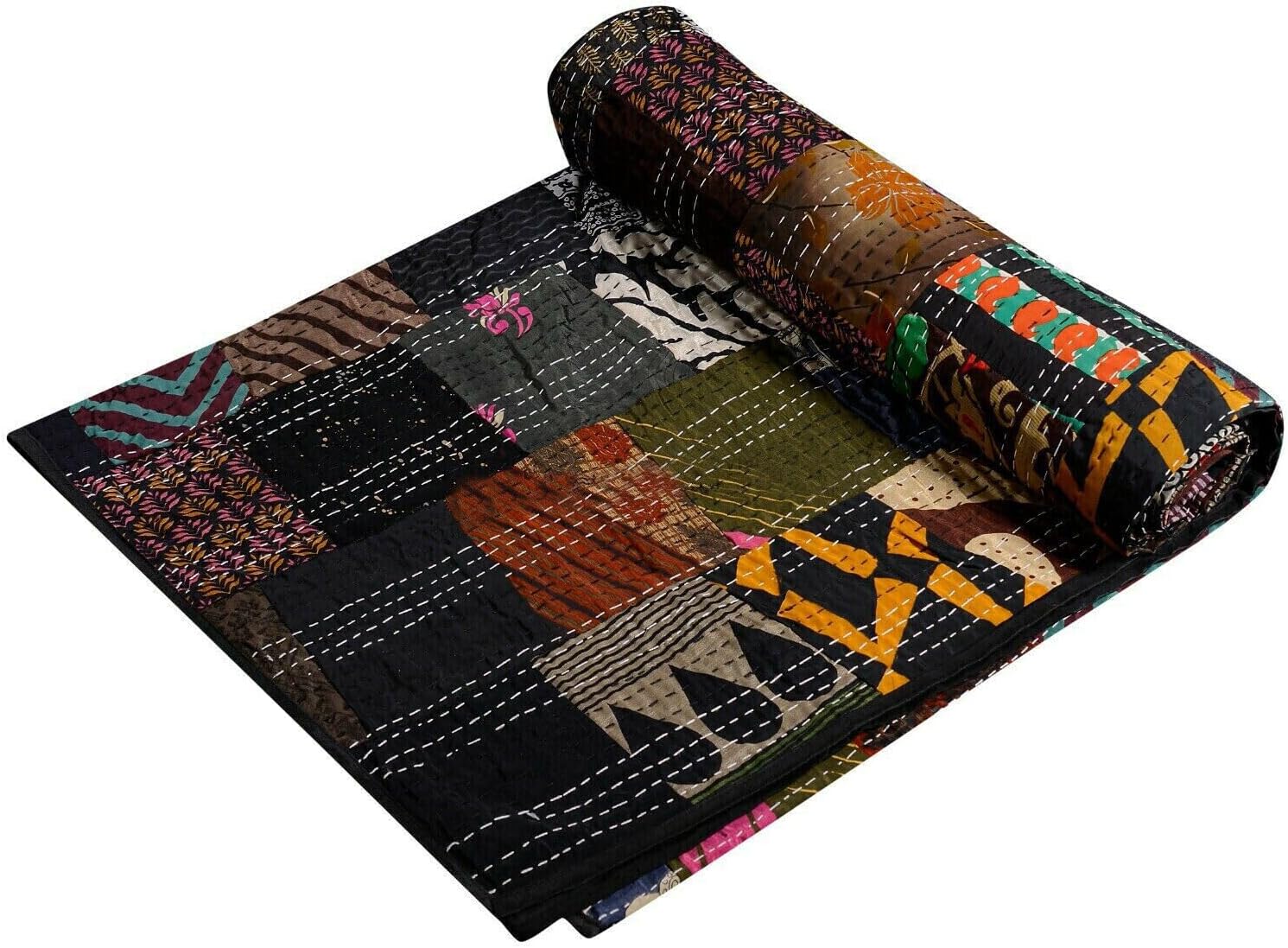 This is a special hand quilted Kantha Old Patola Sari. This work is done in countryside that provides work and livelihood for women in COUNTRYSIDE.The entire quilt is painstakingly embroidered with thousands of small and delicate kantha stitches to create a one of a kind masterpiece! It is made from vintage old silk saris, and softly quilted . It is embroidered by artisans in countryside. Kantha is the ancient Indian art of embroidery, actually the kantha is a simple running stitch. The way in which the stitch has been used is what makes the quilt extraordinary. While making the PIECES, the cloth is given layers that are kept together by the stitches. It is made is such a way that it is REVERSIBLE, can be used from both sides. As this is made from vintage sarees, it has some imperfections. They have patches of other color clothes. they might have some stains, although we wash them well before shipping to remove bad odor and spots. All these imperfections make these vintage art pieces more unique, charming & perfect piece for your home. We hope u would love this art. It is made from vintage old cotton saris, and softly quilted . It is embroidered by artisans in countryside.
