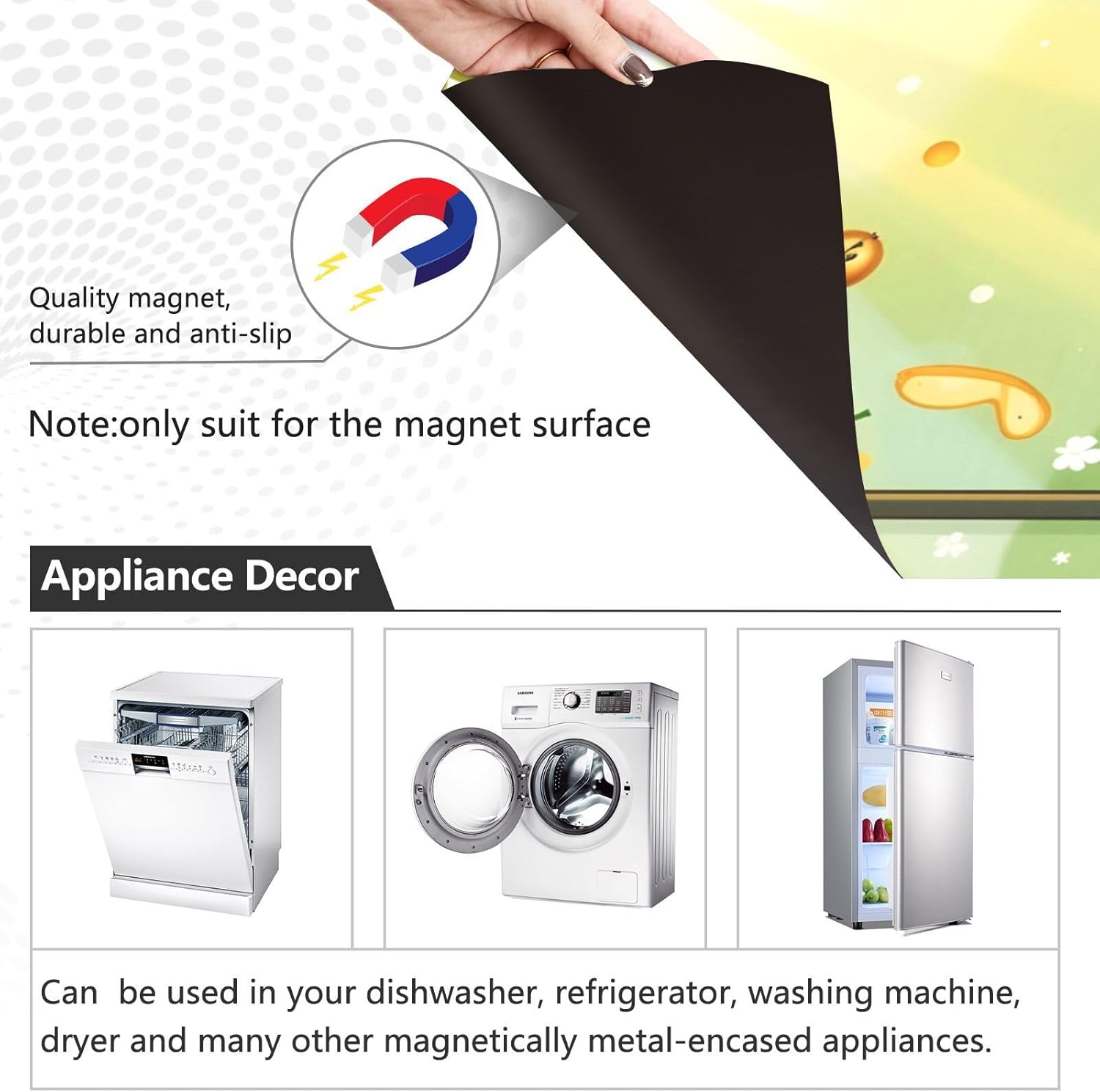 Decorate your kitchen life!This magnetic dishwasher cover is a work of art, decorating your kitchen art, with a sense of fashion and art, highlighting your quality life!Size in 23 x 26 inches. This size fits most dishwashers.Cut it to your own size to fits your need.FeatureWaterproof, heat resistant, scratch and tear resistant. Magnetic stickers hide scratches, dents or other unsightly marks.Magnetic MaterialMagnetic sticker will not fall from magnetic dishwasher and disassemble easily.Protect the dishwasher from scratches, it can also decorate your kitchen home.Please NoteMagnetic dishwasher cover is made of PVC+PET, only suit for the magnet surface.Install: Trim the proofreading position, the magnetic force on the back will stick to it.Ideal GiftYour beloved one will be happy when you give him/her this dishwasher magnet cover gift on the special days like Housewarming Day, Mother's Day, Father's Day, Birthday, Halloween, Thanksgiving, Christmas, New Year.