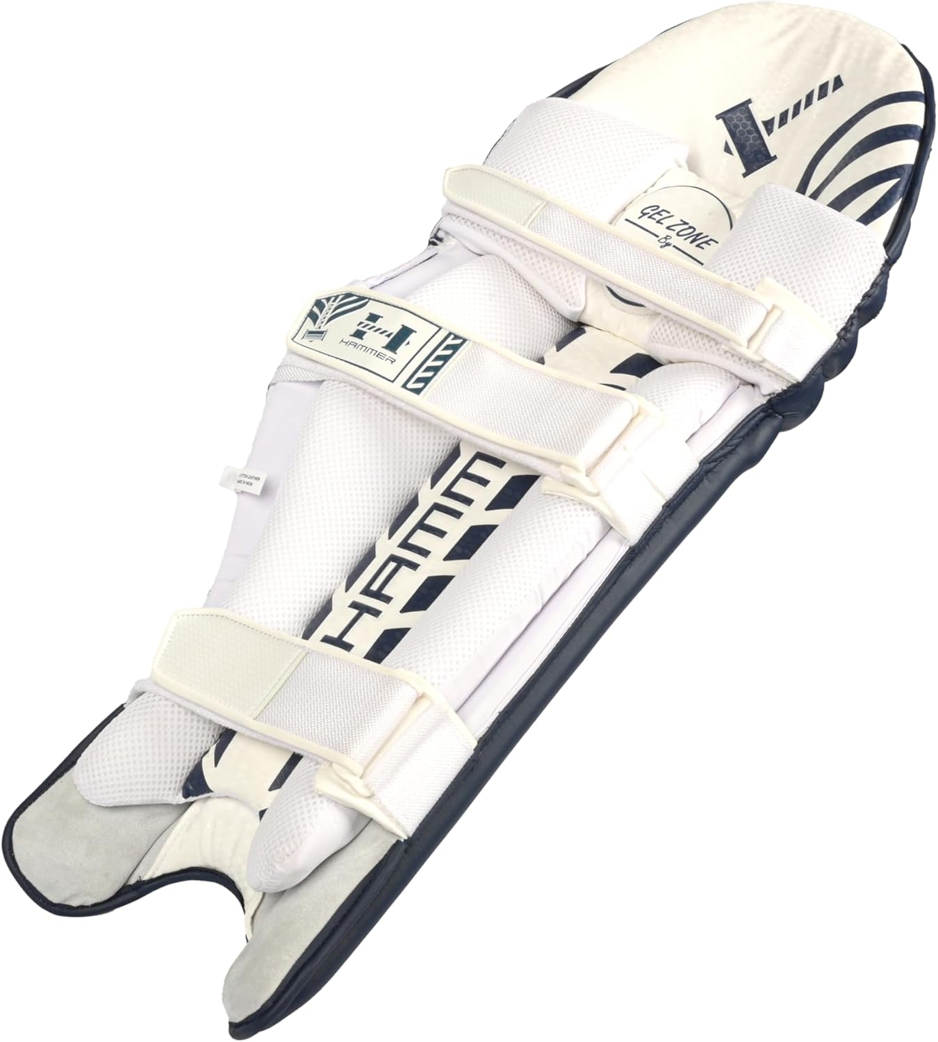 The Hammer Black Edition Batting Pads combine cutting-edge materials with thoughtful design for superior protection without sacrificing mobility. The HD EVA molding with cane backing delivers exceptional impact resistance while the innovative Litefoam knee roll provides flexibility and durability for extended innings. Key features: HD EVA molding foam with cane backing in the front and reinforced top hat area offer superior protection against fast deliveries .Three-section Lite foam knee roll provides better shape retention and protection compared to traditional cotton while reducing weight. Three-strap hook and loop system with hygroscopic backing material to absorb sweat and prevent slippage. Foam-padded areas below straps, tri-flex shin bolsters with air mesh facing, and strategically designed back with hard plastic cup and HD foam sections.High-quality Korean PU exterior in navy with embossed branding throughout for a professional appearance.