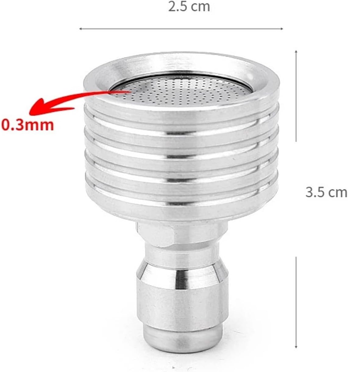 NozzlesHandle Type: Finger GripWater Spray Type: ShowerMaterial: stainless steelColour: silverHole diameter(optional): 0.3mm/0.5mm0.3mm: small hole jet far, small hole outlet pressure high0.5mm: large hole jet near, large hole outlet pressure is smallProduct Length: 35mm/1.38inchProduct Width: 24mm/0.94inchConnection: 1/4 quick-connect