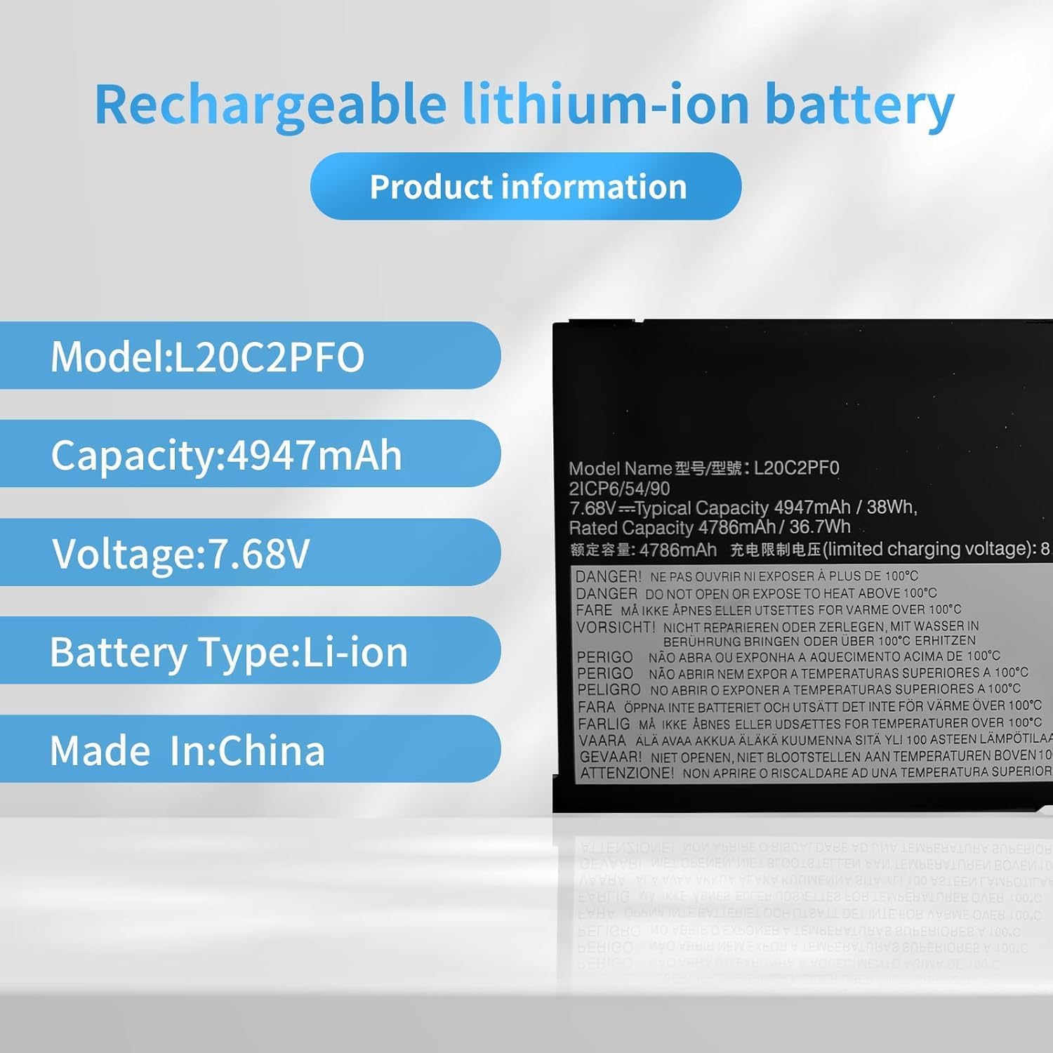 About Us:A professional manufacturer in the field of power tool batteries, laptop batteries and chargers,provides high-quality, real capacity power products with excellent customer service.Specification:Battery Type: Li-ionVoltage:7.68VCapacity: 38Wh 4947mAh Replace Battery Part Number:L20C2PF0 L20M3PF0 L20L3PF0 L20C3PF0 SB11B36276 5B11B36283 SB11B36274 5B11B36279, SB11B36277 5B11B36275,L20L2PF0 SB11B36281 5B11B36285,L20B2PF0 SB11B36272 5B11B36278,L20M2PF8 SB11C94113 5B11C94112,L20C2PF0 SB11B36284 5B11B36273,L20M2PF0 SB11B36282 5B11B36280 Fit For:For Lenovo S14 G2-ITL G3-IAP seriesFor Lenovo V14 G2-ITL G2-ALC G2-IJL G3-IAP G3-ABA seriesFor Lenovo V15 G2-ITL G2-ALC G2-IJL G3-ABA G3-IAP seriesFor Lenovo V15 G3-IAP CTO seriesFor Lenovo V17 G2-ITL G3-IAP seriesFor Lenovo IdeaPad 3-14ADA6 3-14ITL6 3-14ALC6 3-14ABA7 3-14IAU7 3-15ADA6 3-15ALC6 3-15ITL6 3-15IAU7 3-15ABA7 3-17ADA6 3-17ALC6 3-17ITL6 3-17IAU7 3-17ABA7 seriesFor Lenovo K14 (Type: 21CS, 21CT, 21CV, 21CU) seriesIf you are not satisfied with your purchase in any way.Please give us an opportunity to try and make it right,We believe that communication is the best way to solve problems.If you have any questions or need any help,Please contact us at any timeWe will try our best to make you satisfied