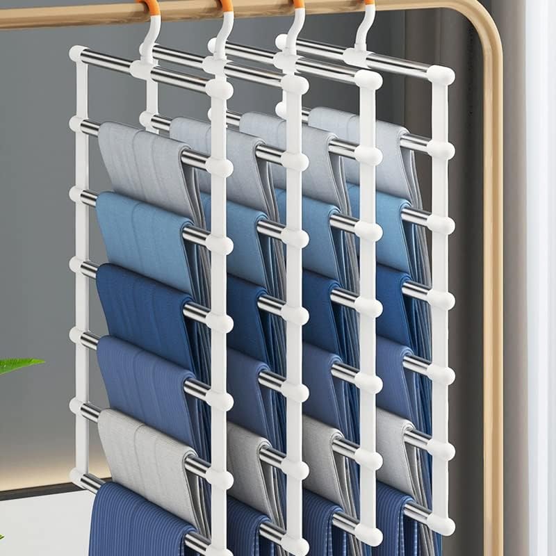1 rack can hang 9 pants, not afraid of too many small pants in the cabinet.Easy Pants Removal - Pull up to get up late without panic.Unbreakable stainless steel tube.Pull the PVC strips constantly.9 tiered hangers that save 9 times the space. A hanger that can only buy new clothes when the closet is empty.Product material: PVC+stainless steel/PVC+aluminum alloycolor: WhiteSize: 62.5*36cm, 36*35.5cmPacking includedHook * 1Note:Please allow 1-2cm errors due to manual measurementItem color displayed in photos may be showing slightly different on your computer monitor since monitors are not calibrated same
