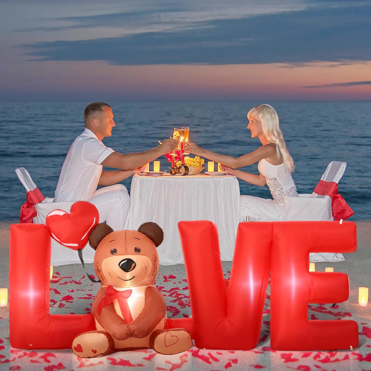 Features: Easy to store: With the compact and lightweight design, you can easily store the Valentine's Day inflatables decor for reuse without occupying much space. Internal LED lights: Bright LED lights are designed to make the inflatables [love] letters with bear decorations become the focus of the night, show up well at night. Which will attract the attention of your neighbors and guests. Specifications: Main color: red and brownMain material: polyesterSize: 9 x 3 ftPackage includes: 1 x Valentine's Day inflatables [love] letters with bear decoration2 x Water bags4 x Fastened ropes, 3.6 ft long10 x Stakes1 x PlugNotes: Manual measurement, please allow slight errors on size. The color may exist slight difference due to different screen display. Do not overinflate the balloons to avoid bursting.